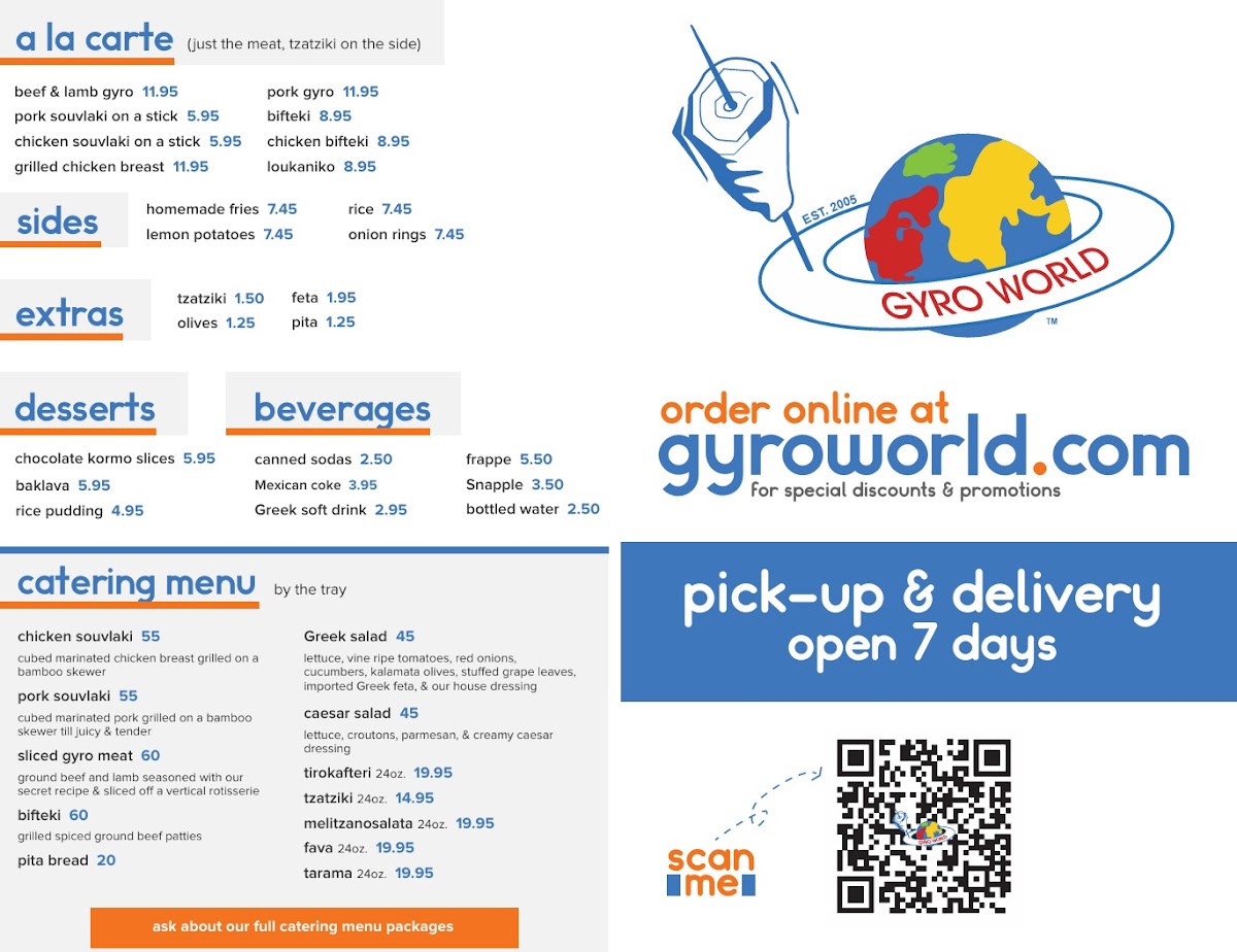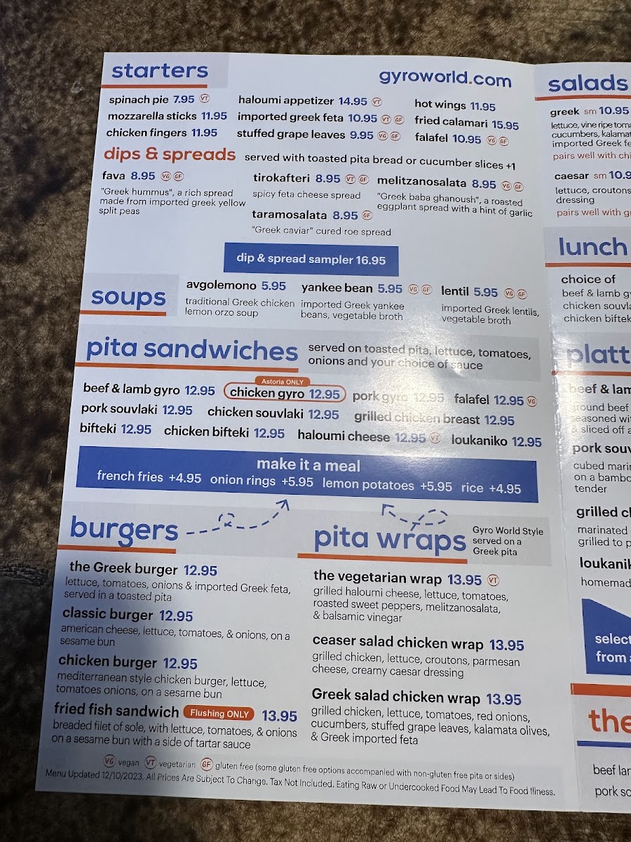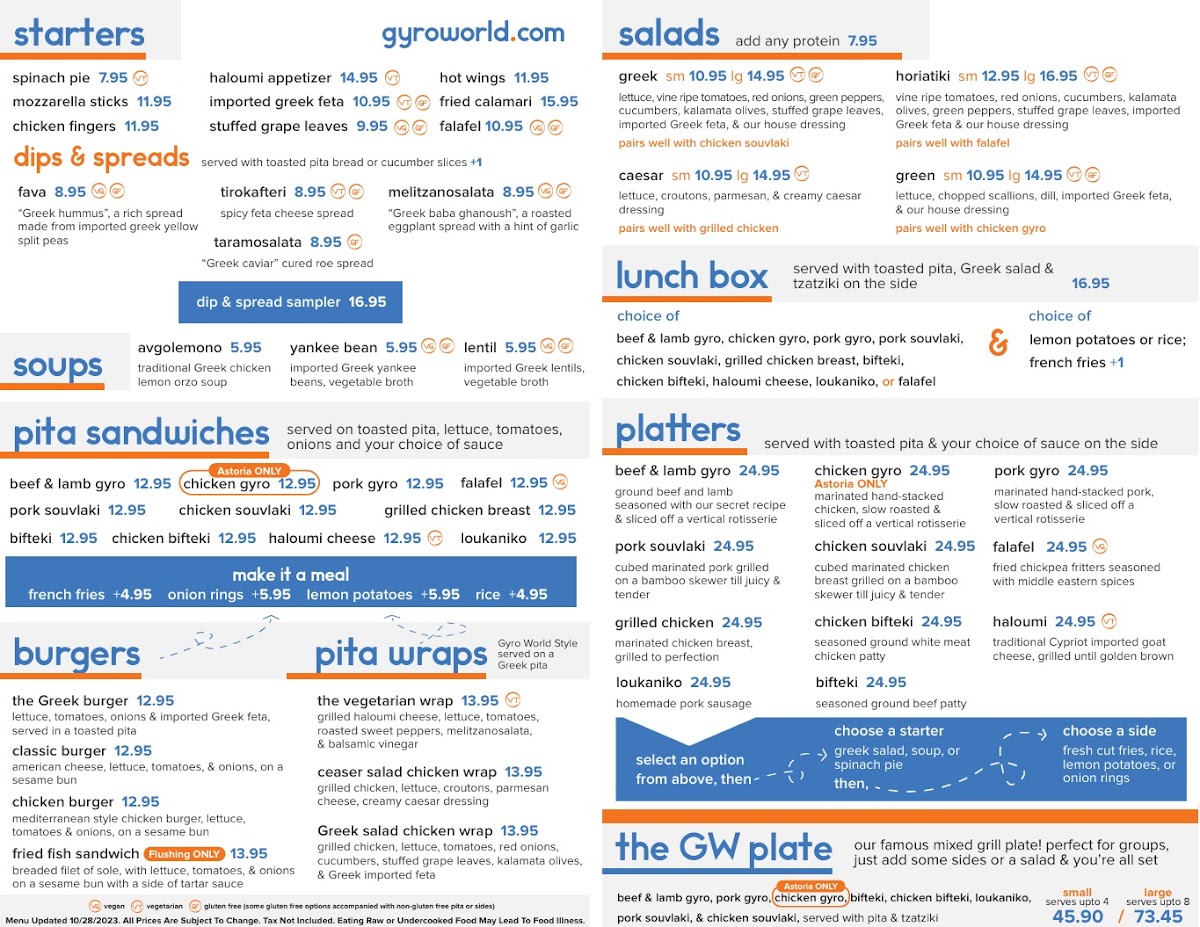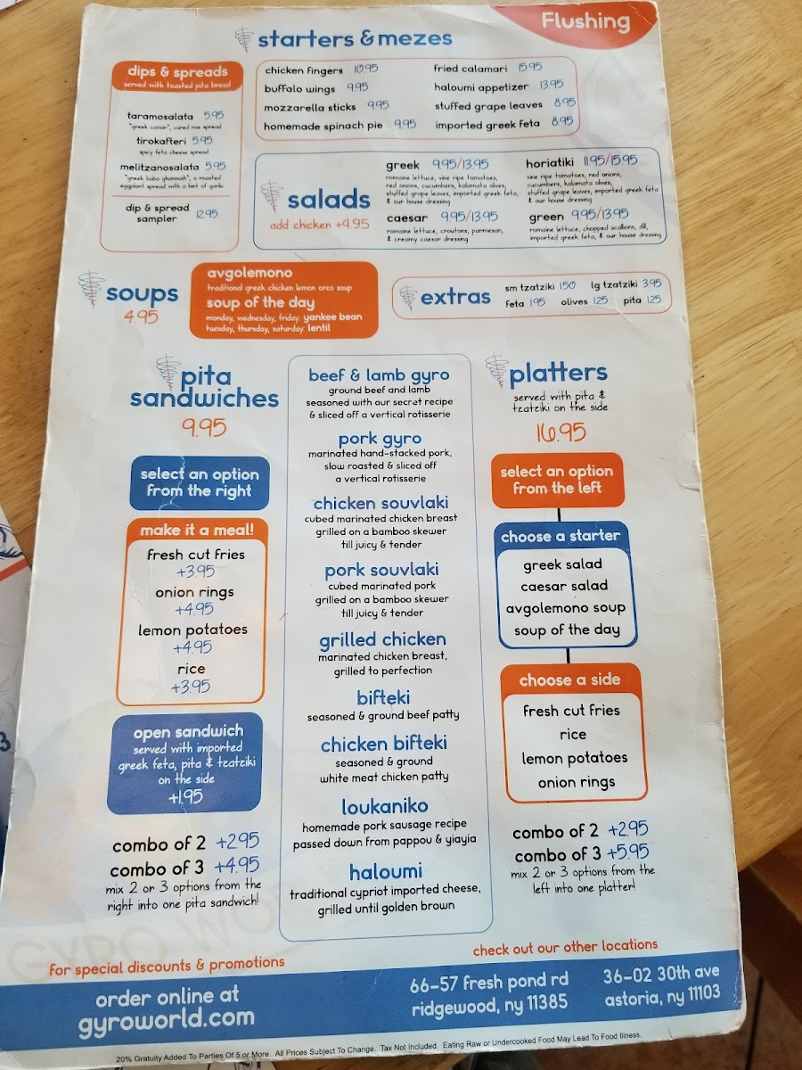 Gyro World Flushing offers a straightforward menu centered around classic Greek and Mediterranean flavors, presented in a casual, welcoming setting. The menu is designed for quick, satisfying meals whether you're grabbing a takeout or settling in for a laid-back lunch or dinner.