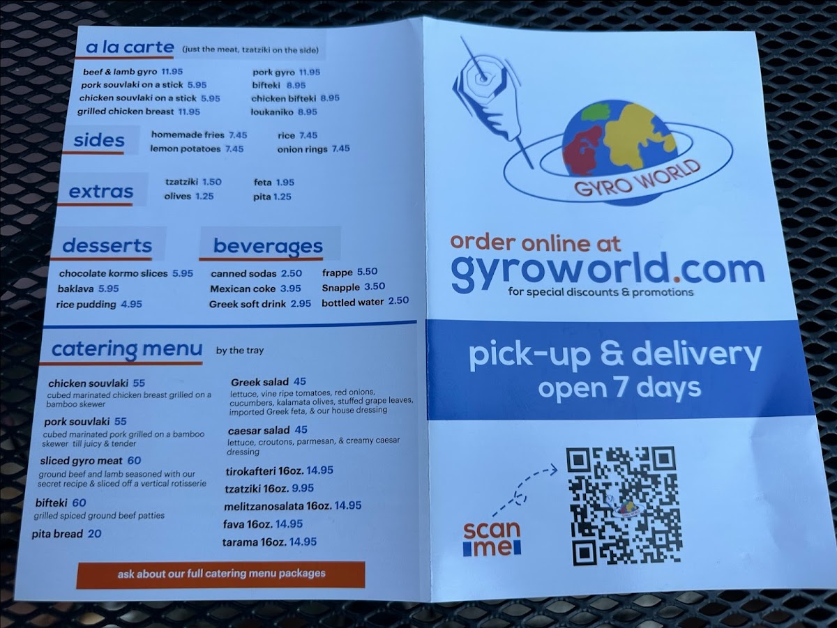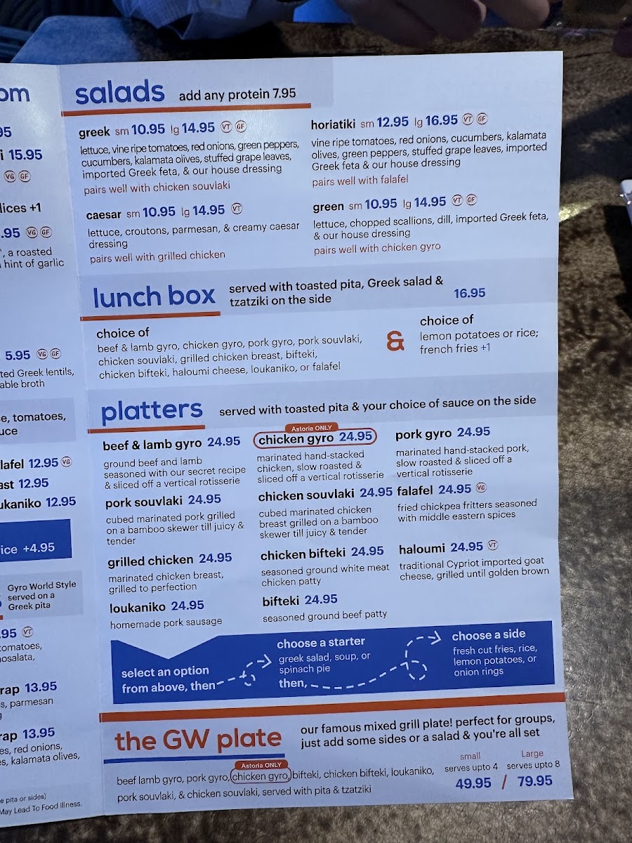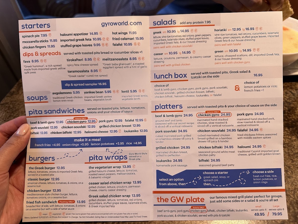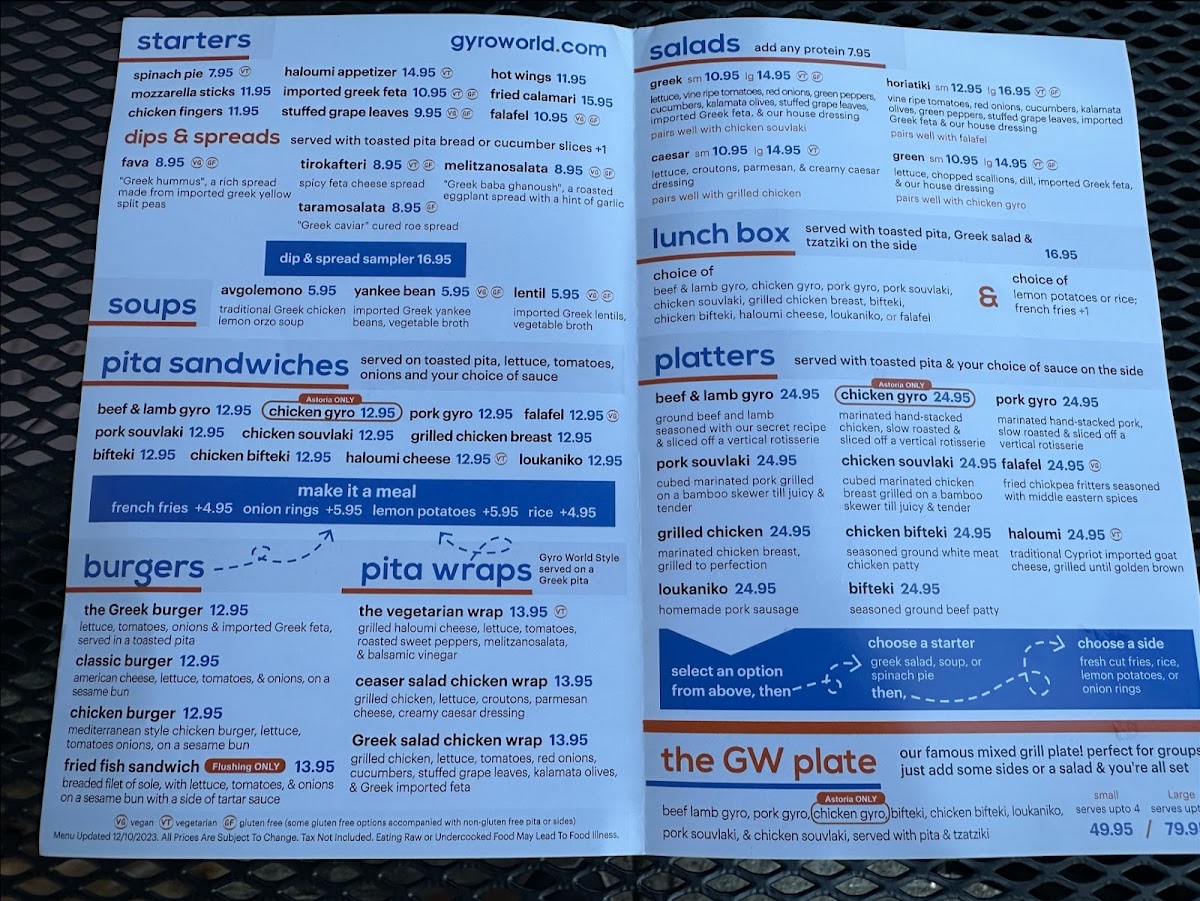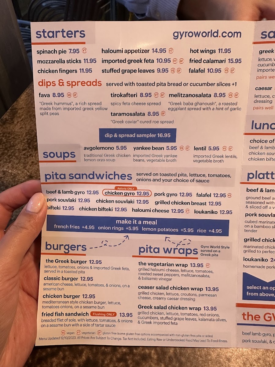 Gyro World Flushing offers a straightforward menu centered around classic Greek and Mediterranean flavors, presented in a casual, welcoming setting. The menu is designed for quick, satisfying meals whether you're grabbing a takeout or settling in for a laid-back lunch or dinner.