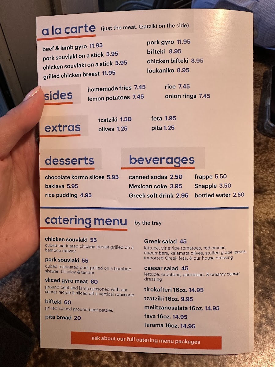 Expect familiar favorites like hearty gyros, souvlaki, and tasty meat platters, alongside comforting starters such as avgolemono soup and crispy onion rings. The menu also includes fresh salads and shareable appetizers like fried calamari and stuffed feta kebabs, perfect for pairing with a cold Mythos beer or a refreshing soft drink.
